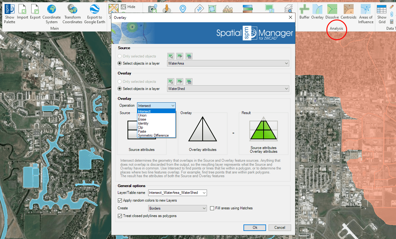 - Process spatial Overlays which will create new drawing entities based on the operation results