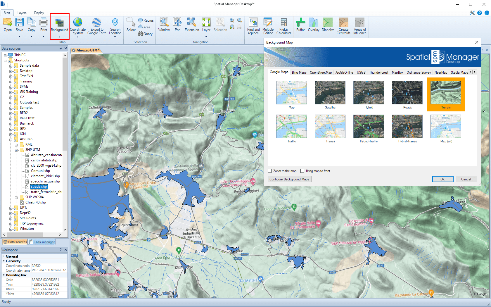 You can select an image map model to show as 'Background Map' in the Map through the "Start" ribbon of Spatial Manager Desktop. This will open the "Background Map" window allowing you to select a model from the Maps list. You can find the list arranged using different Groups (Tabs) for the different preset Providers (OpenStreetMap, Mapbox, etc.) and the User groups (see how to Configure User 'Background Maps'). The image of the dynamic 'Background Map' is automatically adapted to the current Map view and it will be automatically fitted when the Map view changes (zoom, pan, etc.)